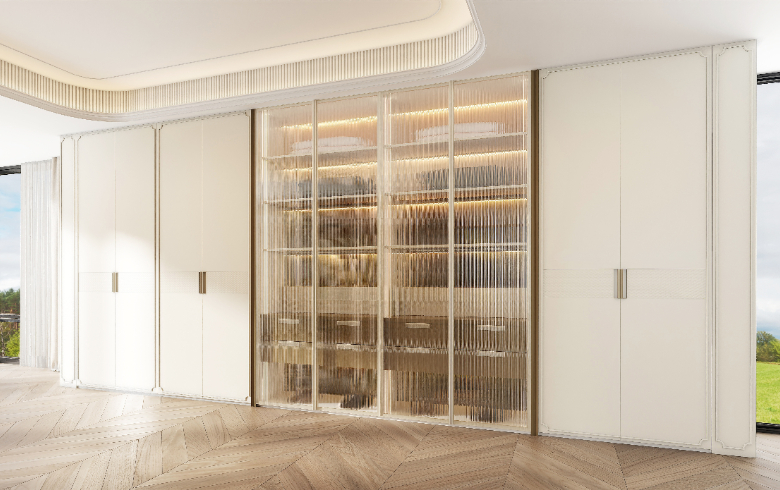 想空間不壓抑,左右對稱的餐酒柜柜門裝上長虹玻璃,忽隱忽現的美感更誘人。