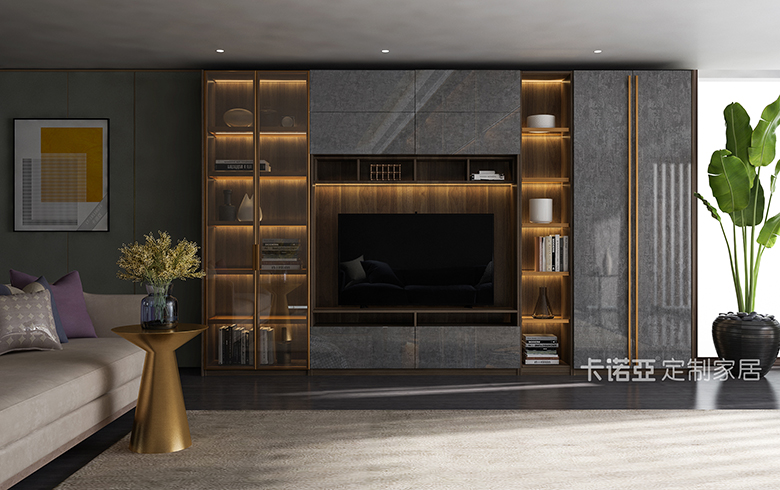 輕奢格調的客廳給人以低調奢華的簡約感,深色木紋肌理的電視柜定調了自然溫潤、質樸真實的舒適感。簡約茶幾與空間保持統一格調,疏密有致,調節空間節奏感,使客廳和諧有序。