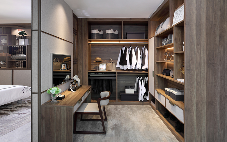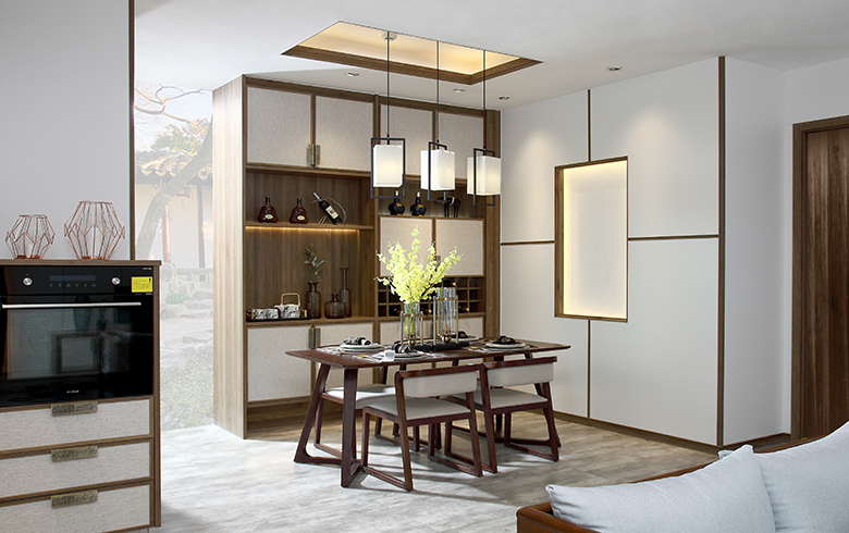 君子遠離庖廚,煙雨江南廚房讓人愛上下廚。新中式廚房更注重實用性,L型廚柜設計科學合理的操作動線,遵從洗、切、炒的料理順序,讓美味佳肴在行云流水的烹飪中輕松搞定。大量定制的地柜和吊柜以及柜內暗藏的轉角拉籃,極大提升廚房的儲物功能,智能感應燈讓下廚更愜意。