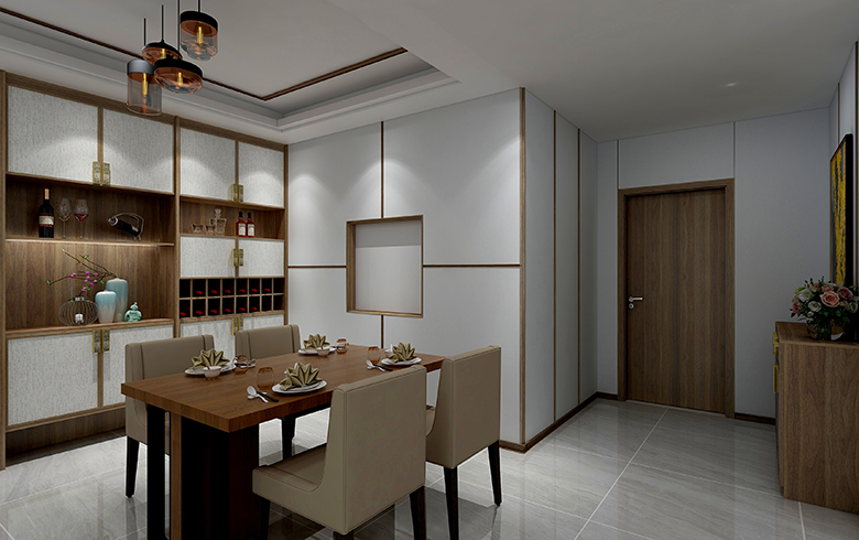 餐廳護(hù)墻系統(tǒng)巧妙運(yùn)用專(zhuān)利扣線,將墻面護(hù)墻板無(wú)縫銜接,構(gòu)筑中式特有的回字形造型,整體簡(jiǎn)潔美觀、雍容大方。