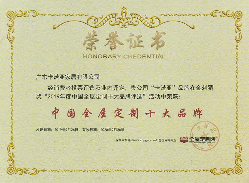 卡諾亞定制家居榮獲“中國全屋定制十大品牌”